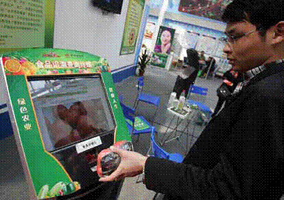 第十六届西洽会安徽展区内,一名工做人员将贴有指定标签包拆好的蔬菜正在“食物逃溯查询终端”系统上一扫,屏幕上当即显示出蔬菜的名称、编号、产地、农药残留检测成果和发卖地址等多种消息。图/CFP!